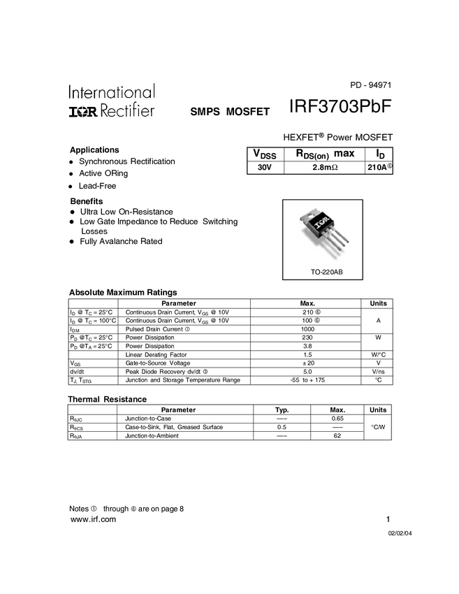 IRF3703PBF MOSFET Infineon Technologies IRF3703PBF N/A N/A IRF3703PBF