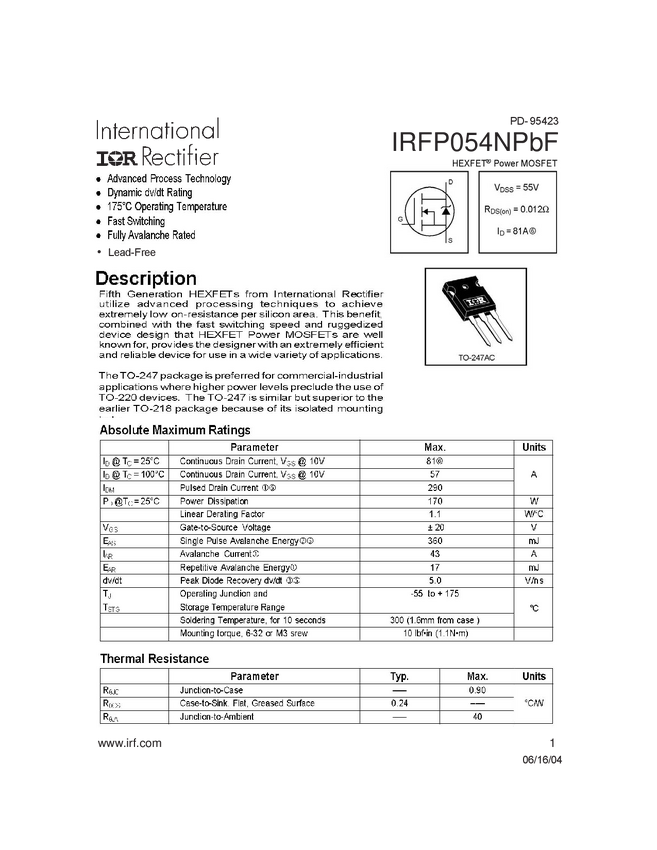 MOSFET Infineon Technologies IRFP054NPBF N/A N/A IRFP054NPBF