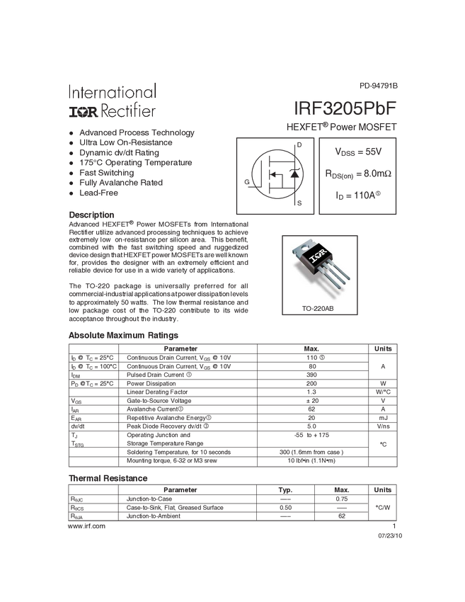 IRF3205PBF MOSFET Infineon Technologies IRF3205PBF N/A N/A IRF3205PBF