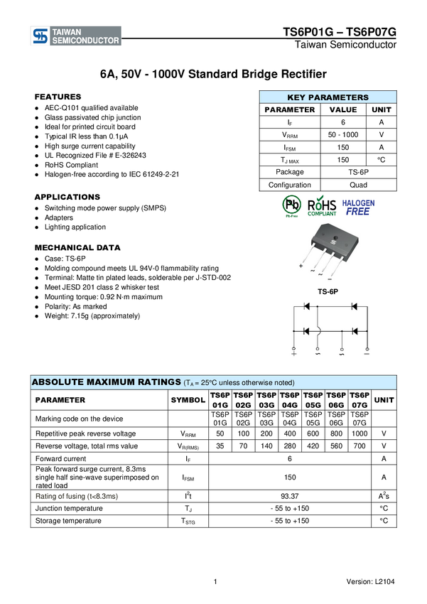 Taiwan Semiconductor TS6P04G Prostownik mostkowy TS-6P 400 V Strzałka - poczwórna tuba