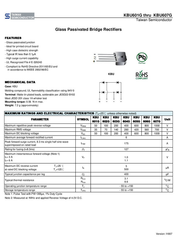 Taiwan Semiconductor KBU607G Prostownik mostkowy KBU 1.000 V paleta