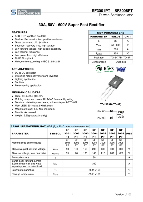 SF3002PT Dioda ESD Taiwan Semiconductor SF3002PT N/A N/A