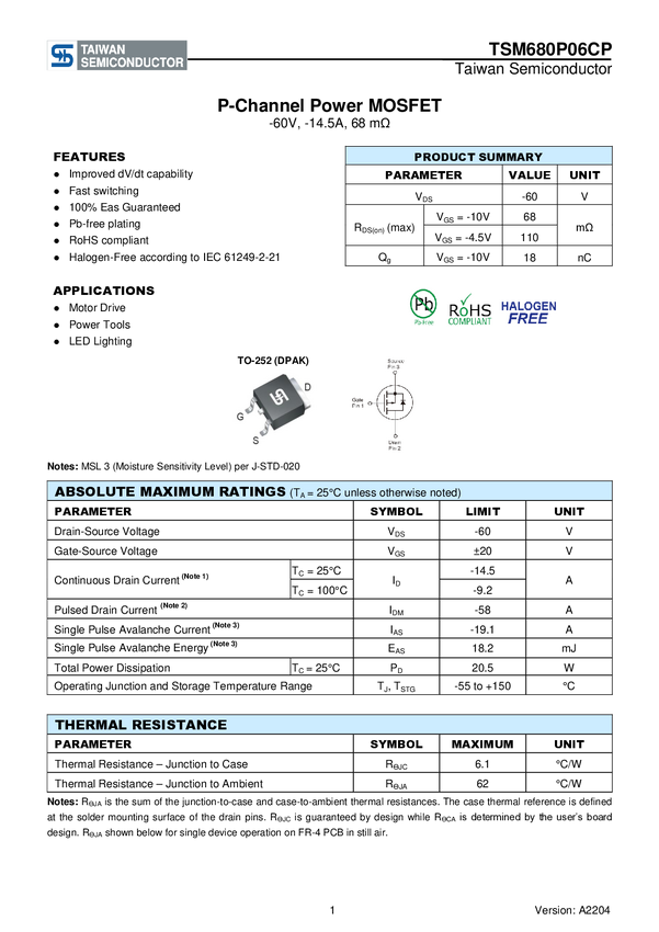 P-Ch 60 V 18 A 20 W 0,068R TO252 Taiwan Semiconductor TSM680P06CP ROG N/A N/A TSM680P06CP ROG