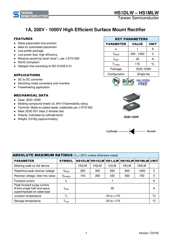 HS1MLW Dioda ESD Taiwan Semiconductor HS1MLW N/A N/A