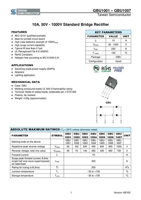 Taiwan Semiconductor GBU1007 Prostownik mostkowy GBU 1.000 V Strzałka - poczwórna tuba