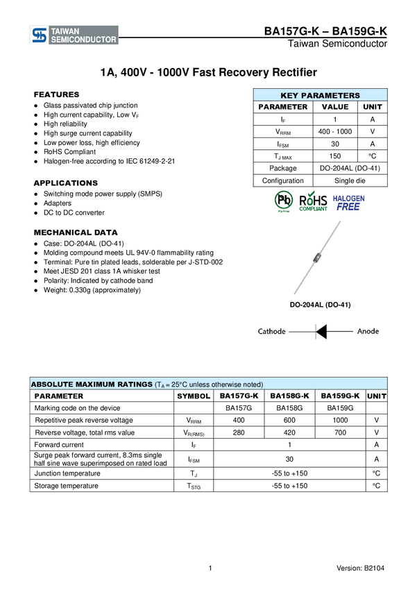 Taiwan Semiconductor Dioda prostownicza 1 mA BA158G-K Pojedynczy taśma