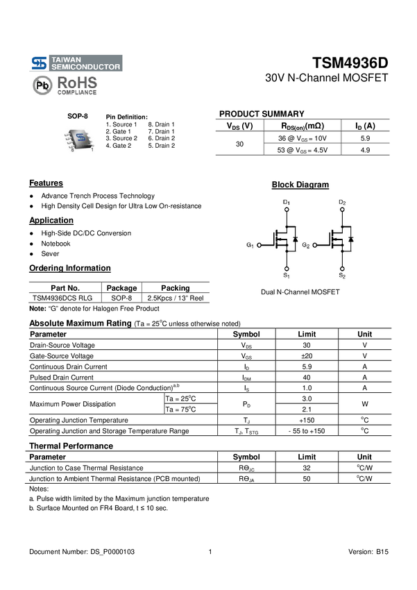 TSM4936DCS RLG 2xN-Ch 30V 5,9A 3W 0,036R SO8 Taiwan Semiconductor TSM4936DCS RLG N/A N...