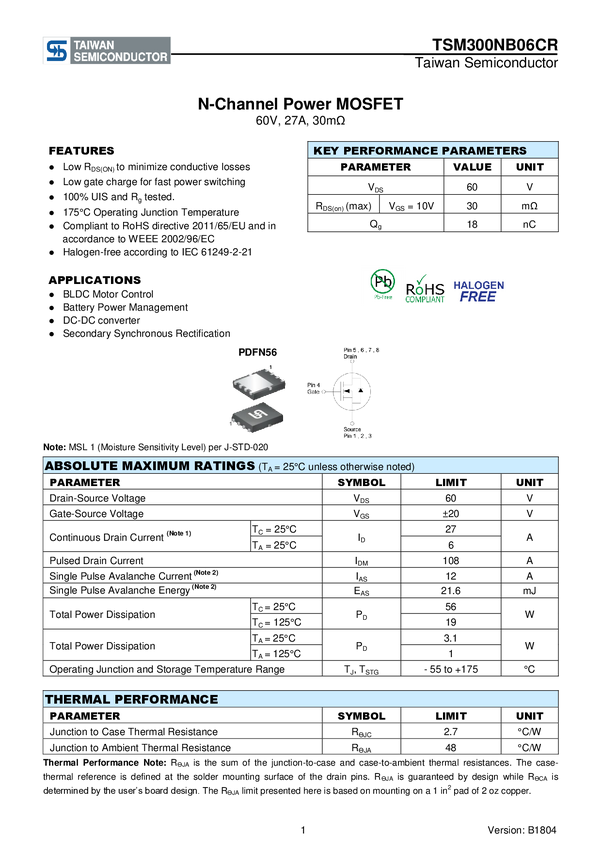 N-Ch 60 V 27 A 56 W 0,03R PDFN56 Taiwan Semiconductor TSM300NB06CR RLG N/A N/A TSM300NB06CR RLG