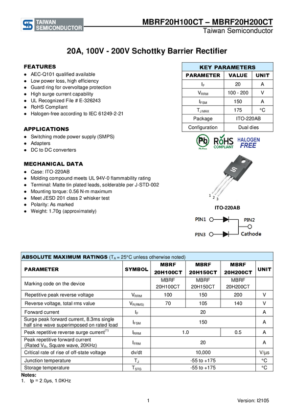 Dioda Schottky'ego Taiwan Semiconductor MBRF20H200CT N/A N/A N/A