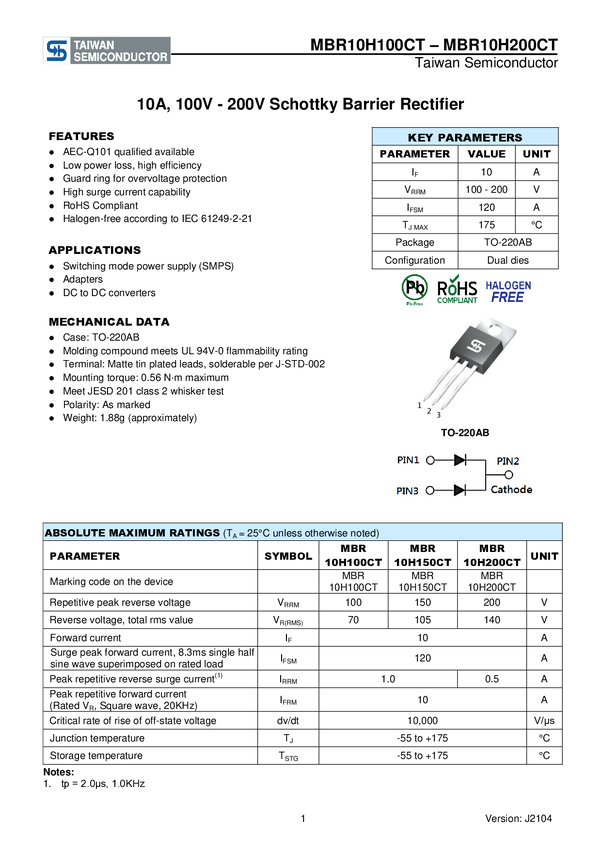 Dioda Schottky'ego Taiwan Semiconductor MBR10H200CT N/A N/A N/A