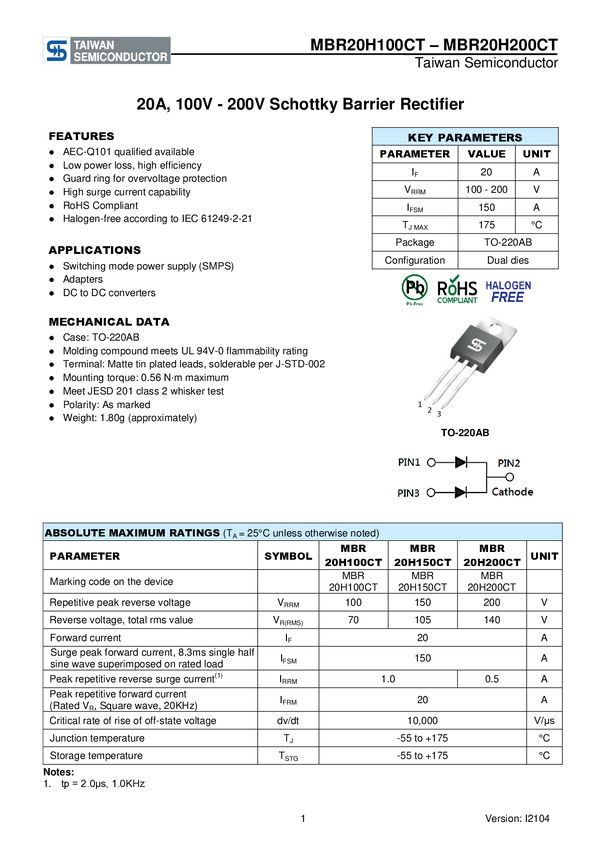 Dioda Schottky'ego Taiwan Semiconductor MBR20H100CT N/A N/A N/A
