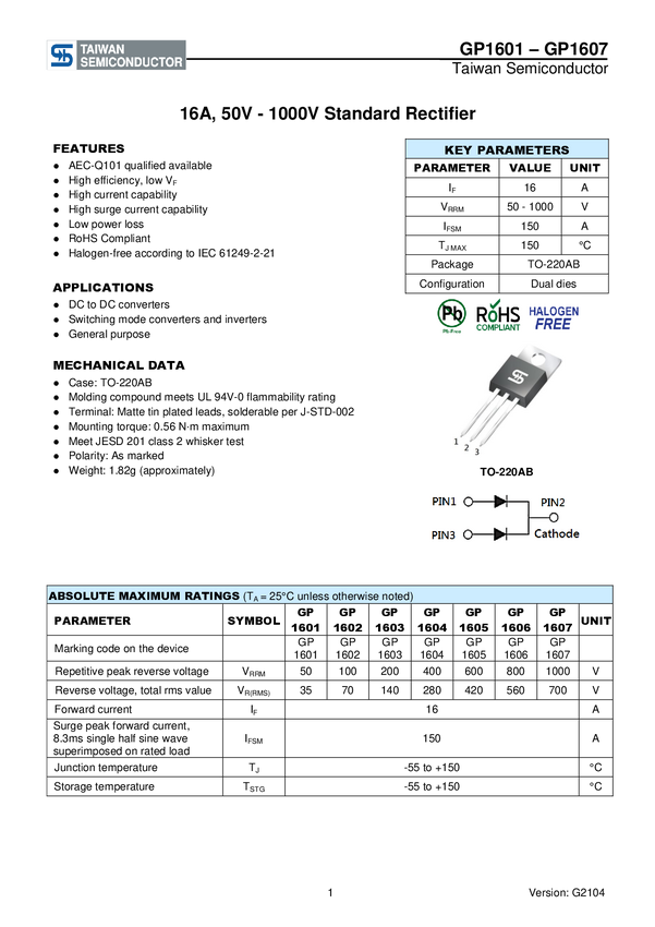Taiwan Semiconductor Dioda prostownicza 16 mA GP1607 TO-220AB Strzałka - podwójna tuba