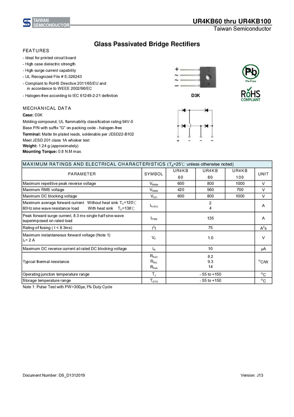 UR4KB60-B Taiwan Semiconductor UR4KB60-B Prostownik mostkowy D3K 600 V towar pakowany...