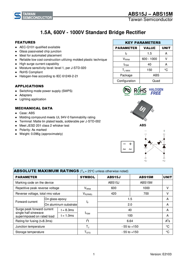 ABS15J Taiwan Semiconductor ABS15J Prostownik mostkowy ABS 600 V taśma na dużej ro...