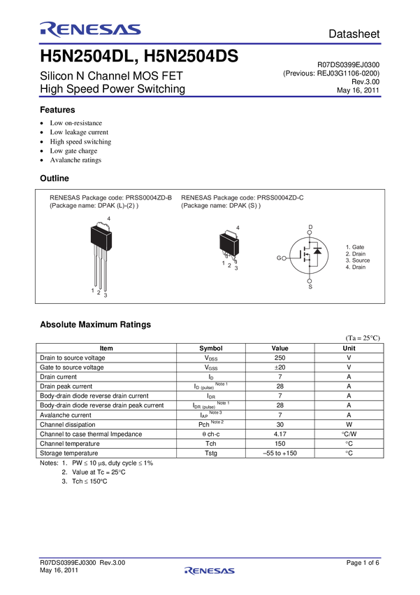 H5N2504DSTR-E Nch Single Power Mosfet 250V 7A 630Mohm DPAK(S)/To-252