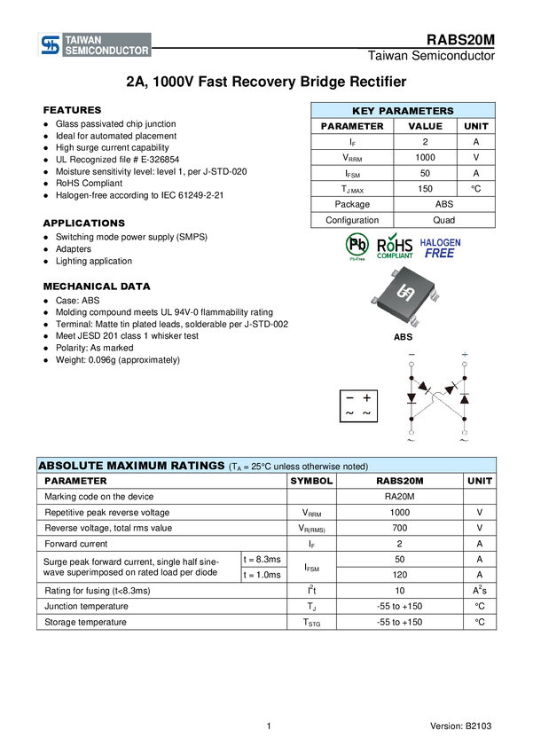 Taiwan Semiconductor RABS20M Prostownik mostkowy ABS 1.000 V Strzałka - poczwórna taśma na dużej rolce