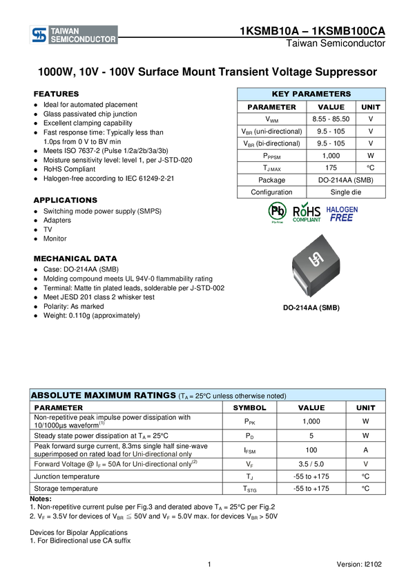 1KSMB18A Dioda TVS Taiwan Semiconductor 1KSMB18A 1KSMB18A, 1 szt.