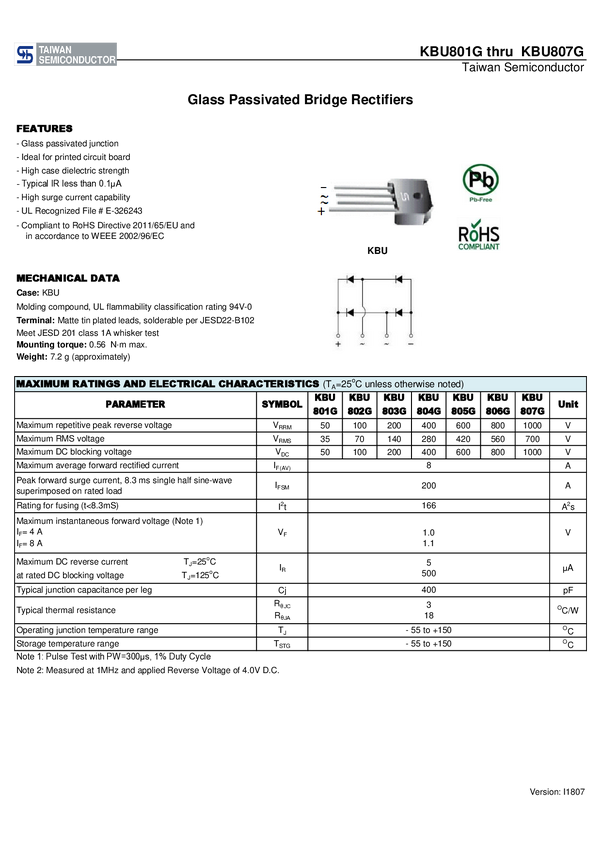 KBU802G Taiwan Semiconductor KBU802G Prostownik mostkowy KBU 100 V paleta