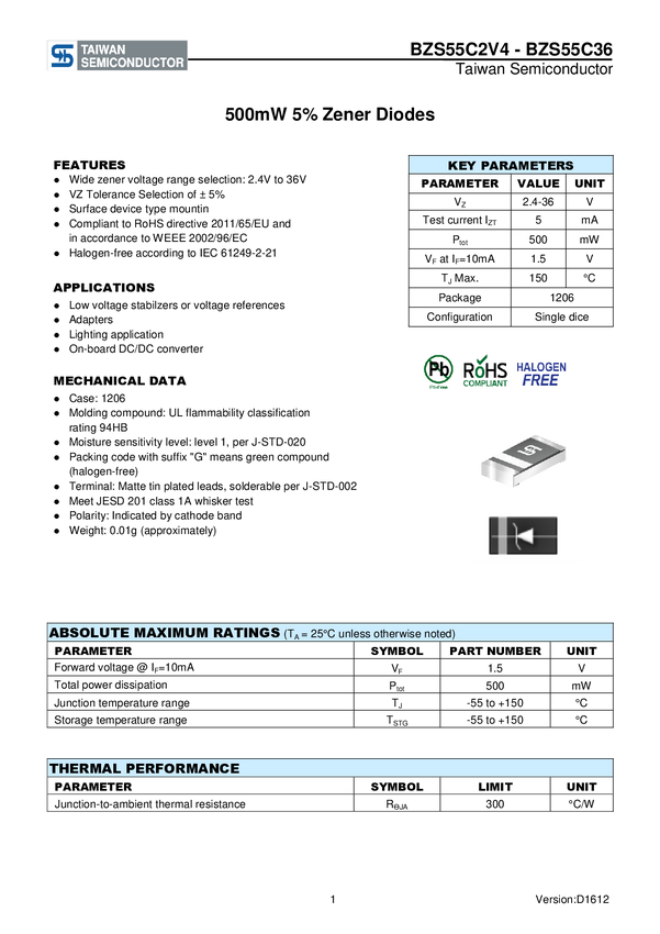 Taiwan Semiconductor Dioda Zenera BZS55C3V9 RXG Typ obudowy półprzewodnika 1206 taśma na dużej rolce
