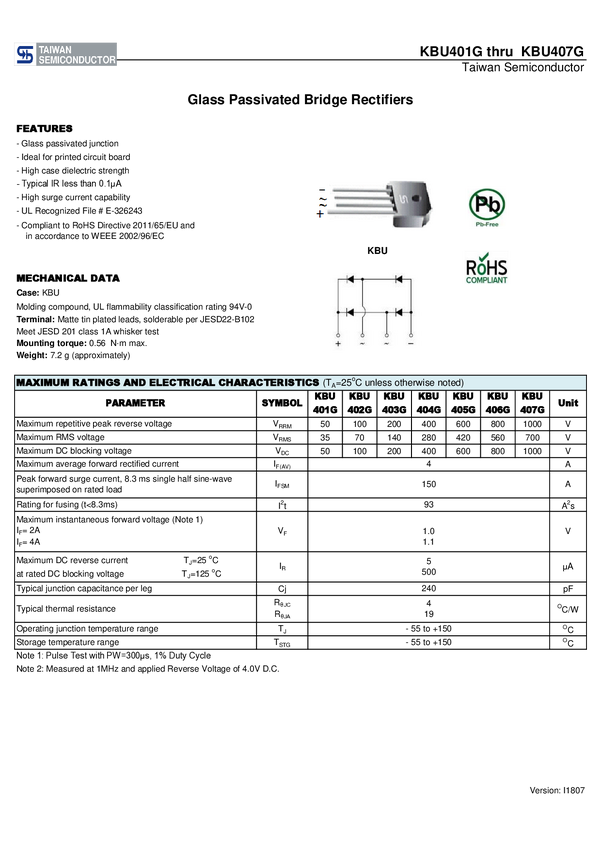 KBU403G Taiwan Semiconductor KBU403G Prostownik mostkowy KBU 200 V paleta