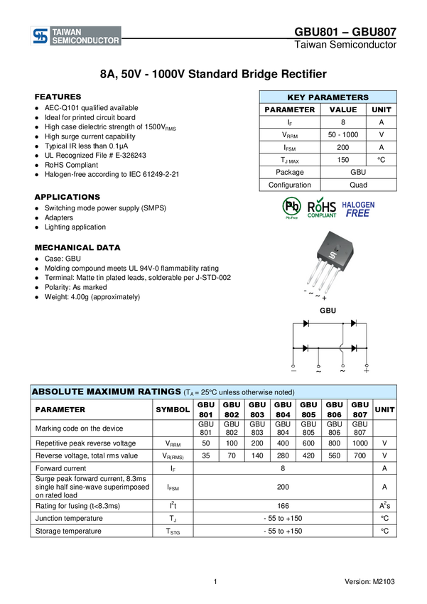 Taiwan Semiconductor GBU802 Prostownik mostkowy GBU 100 V Strzałka - poczwórna tuba