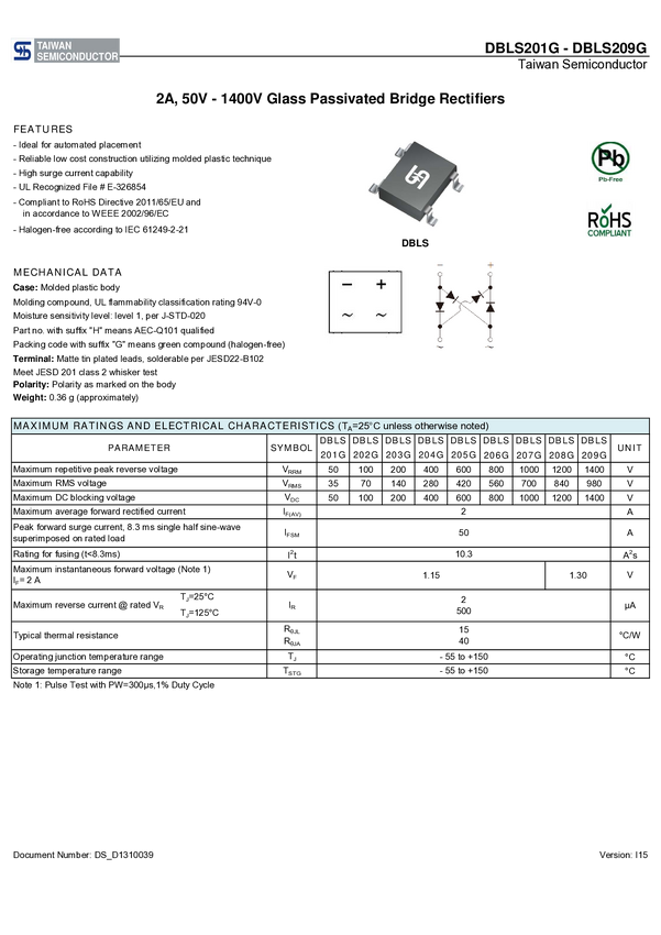 DBLS207G Taiwan Semiconductor DBLS207G Prostownik mostkowy DBLS 1.000 V taśma na duż...
