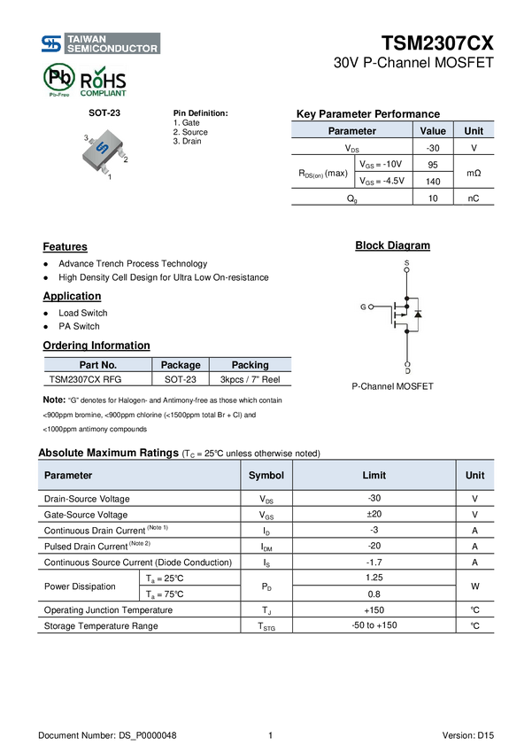 P-Ch 30V 3A 1,25W 0,08R SOT23 Taiwan Semiconductor TSM2307CX RFG N/A N/A TSM2307CX RFG
