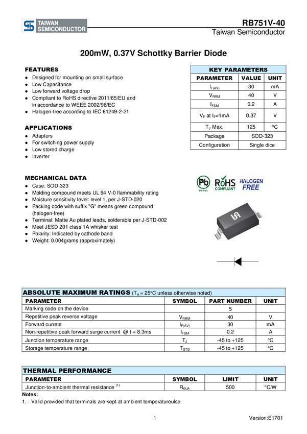 Dioda Schottky'ego Taiwan Semiconductor RB751V-40 RRG N/A N/A N/A U(RRM) 40 V