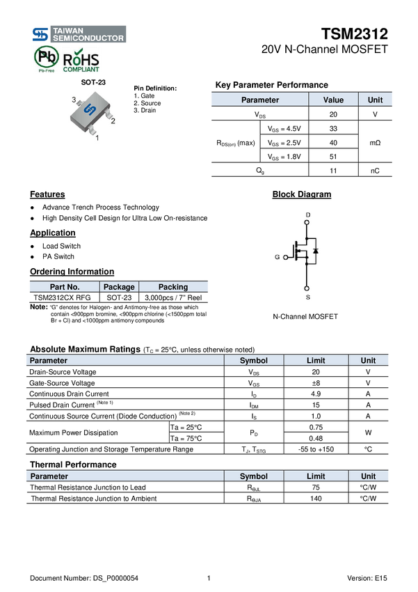 N-Ch 20 V 5 A 1,25 W 0,033R SOT23 Taiwan Semiconductor TSM2312CX RFG N/A N/A TSM2312CX RFG