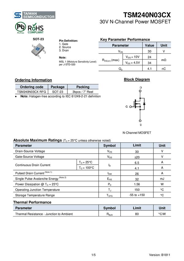 N-Ch 30 V 6,5 A 1,56 W 0,024R SOT23 Taiwan Semiconductor TSM240N03CX RFG N/A N/A TSM240N03CX RFG