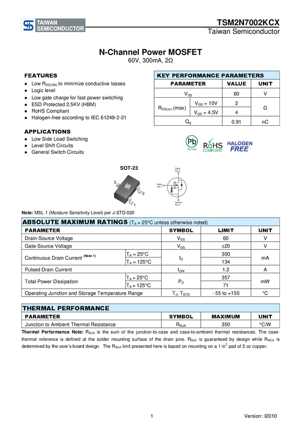 N-Ch 60 V 0,3 A 0,2 W 4R SOT23 Taiwan Semiconductor TSM2N7002KCX RFG N/A N/A TSM2N7002KCX RFG