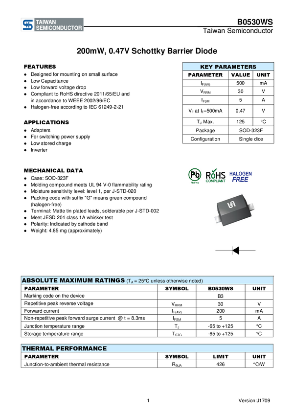 Dioda Schottky'ego Taiwan Semiconductor B0530WS RRG N/A N/A N/A U(RRM) 30 V