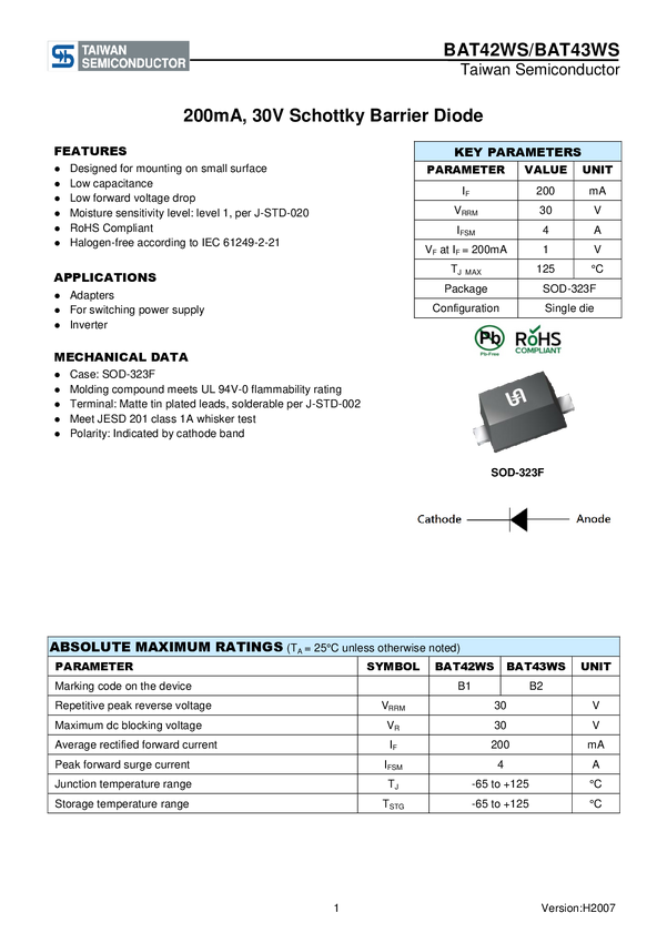 Dioda Schottky'ego Taiwan Semiconductor BAT43WS RRG N/A N/A N/A U(RRM) 30 V