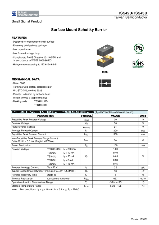 Dioda Schottky'ego Taiwan Semiconductor TSS42U RGG N/A N/A N/A U(RRM) 30 V