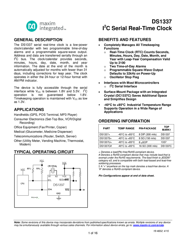 DS1337S+T&R Układu scalony Czas / Zegar RTC Maxim Integrated DS1337S+T&R DS1337...