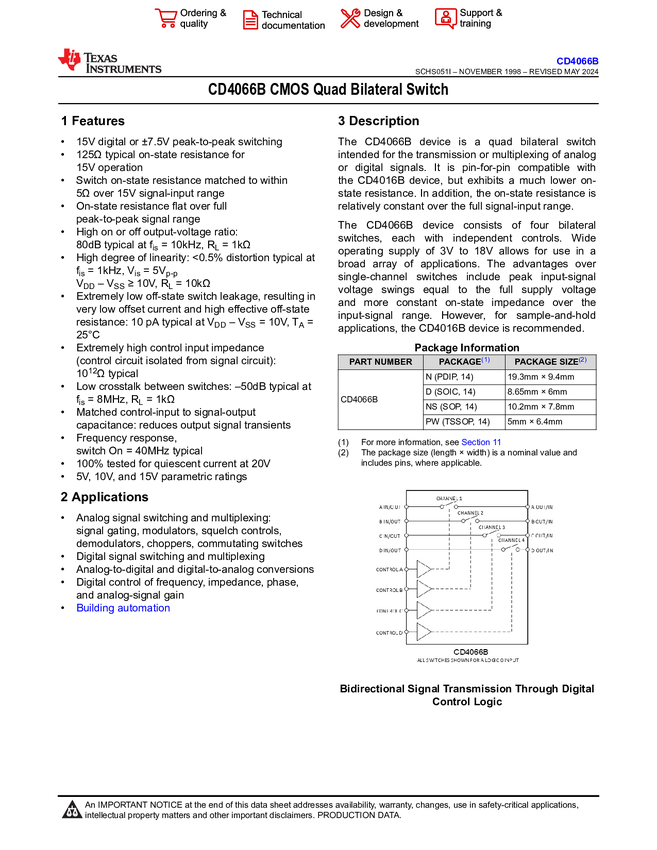 Układ scalony interfejsów - Przełącznik analogowy Texas Instruments CD4066BE, 1 szt.