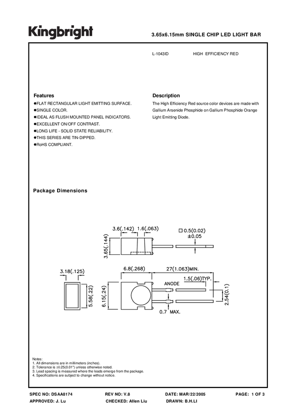 L-1043IDT Dioda LED THT Kingbright L-1043IDT, 3.65 x 6.15 mm, 10 mcd, 1 szt.