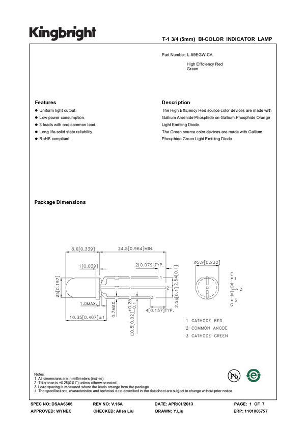 L-59EGW-CA Dioda wielokolorowa LED Kingbright L-59EGW-CA, 5 mm, 6 mcd, 8 mcd, 1 szt.