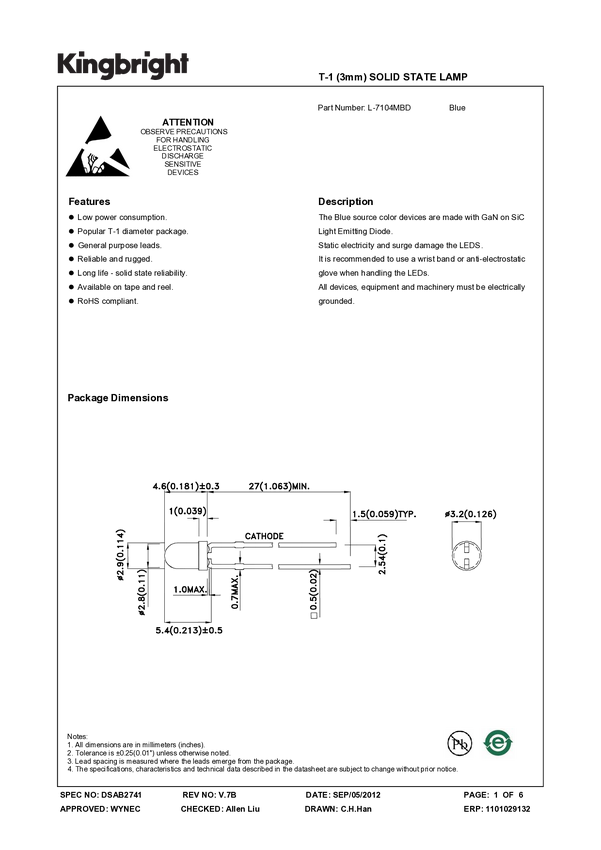 L-7104MBD Dioda LED THT Kingbright L-7104MBD, 3 mm, 40 mcd, 1 szt.