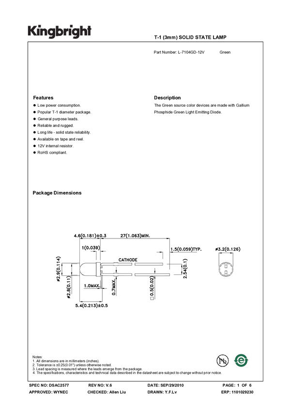 L-7104GD-12V Dioda LED THT Kingbright L-7104GD-12V, 3 mm, 20 mcd, 1 szt.