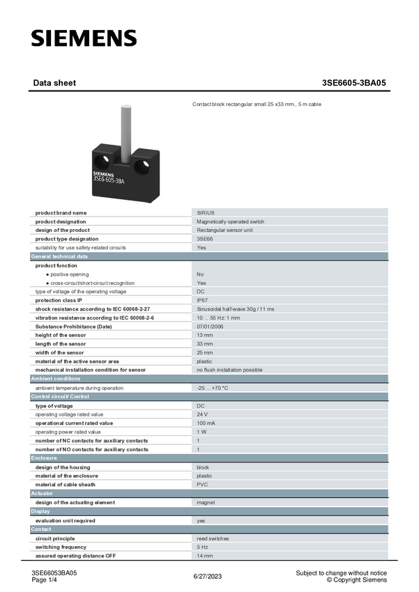 3SE66053BA05 Siemens Element przełączający 3SE6605-3BA05