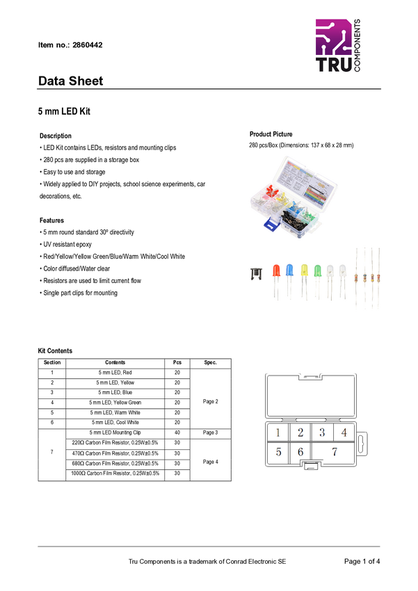 Dioda LED THT TRU COMPONENTS TC-11441768, 5 mm, 90 mcd, 420 mcd, 2180 mcd, 19000 mcd, 280 szt.