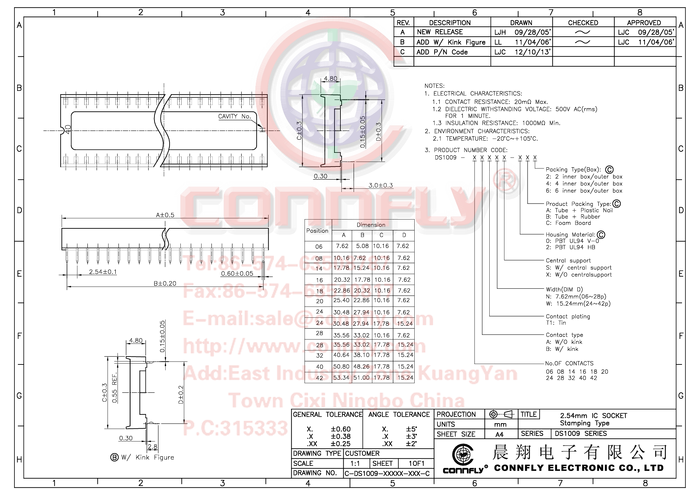 DS1009-14AT1NX-0A2 Connfly DS1009-14AT1NX-0A2 Podstawka pod układy scalone Wymiary siatki: 2.5...