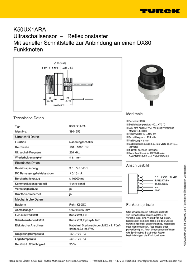 3804556 Turck K50UX1ARA Przycisk refleksyjny, ultradźwękowy 1 szt. 3.5 - 5.5 V Maks...