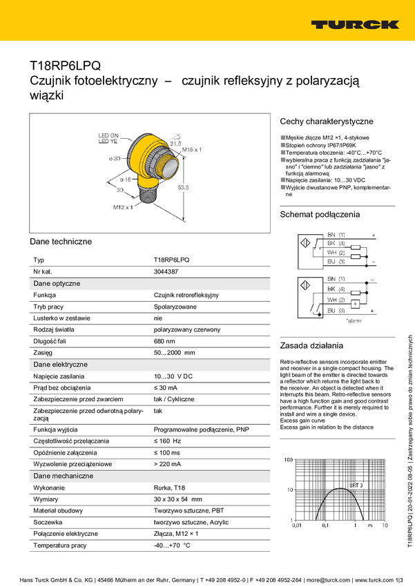 3044387 Fotokomórka odbiciowa Turck T18RP6LPQ 3044387 1 szt.