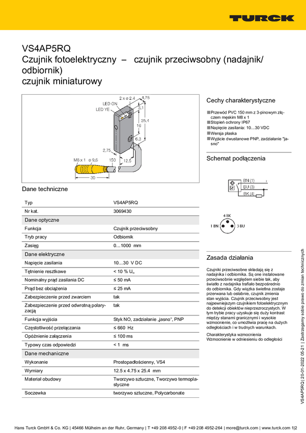 Bezzwrotny czujnik fotoelektryczny Turck VS4AP5RQ 3069430 1 szt.