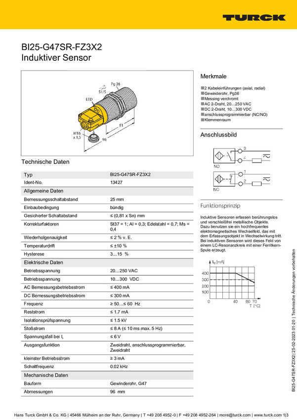 13427 Czujnik indukcyjny Turck BI25-G47SR-FZ3X2, 20 - 250 V, 1 szt.