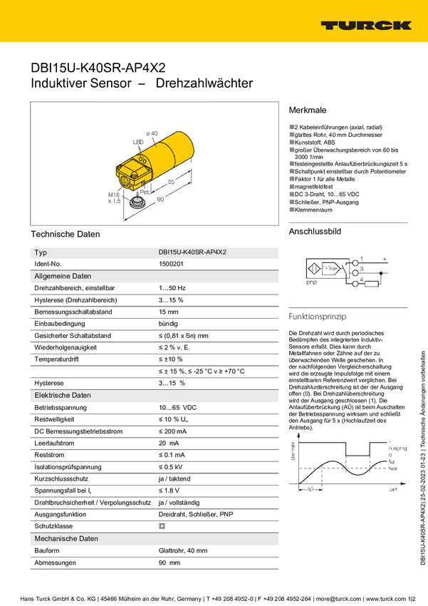 1500201 Turck Czujnik indukcyjny podtynkowy PNP, Zamykający DBI15U-K40SR-AP4X2