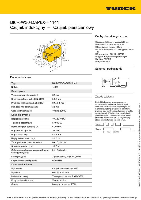 14036 Czujnik indukcyjny Turck BI6R-W30-DAP6X-H1141, 10 - 30 V, 1 szt.