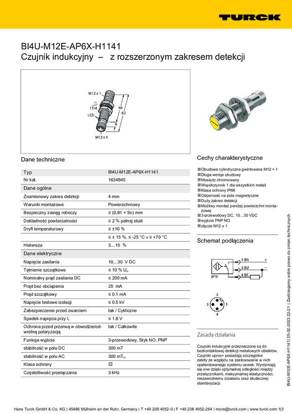 Czujnik indukcyjny Turck BI4U-M12E-AP6X-H1141, 10 - 30 V, 1 szt.